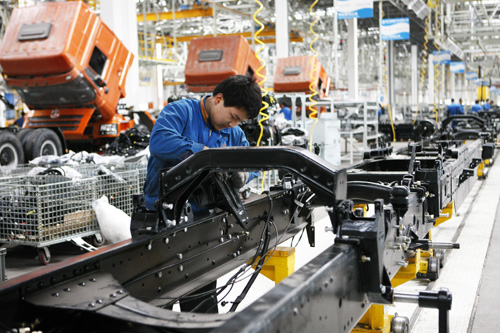 3月15日,陕汽新疆汽车有限公司的员工在对车辆进行总装。据了解,该公司是新疆汽车装备制造产业中首家从事整车生产的企业。截至2012年,该公司产销各类商用车突破4000辆,实现工业总产值10亿元,销售收入达9.5亿元,上交利税1500万元。 (谢龙 摄)