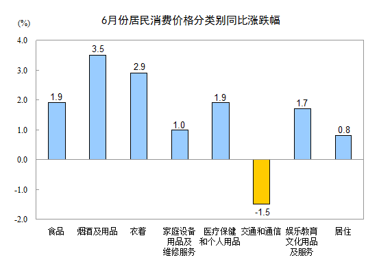 6月份,非食品价格同比上涨1.2%。其中,烟酒及用品、衣着、医疗保健和个人用品、娱乐教育文化用品及服务、家庭设备用品及维修服务、居住价格分别上涨3.5%、2.9%、1.9%、1.7%、1.0%和0.8%;交通和通信价格下降1.5%。