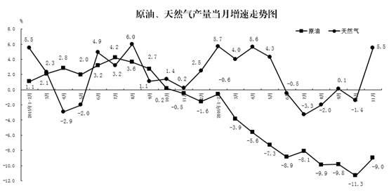 按照行业主管部门做好天然气迎峰度冬工作的要求,天然气生产企业积极落实增产计划,产量增长明显。11月份,天然气产量123.5亿立方米,由10月份同比下降1.4%,转为同比增长5.5%。