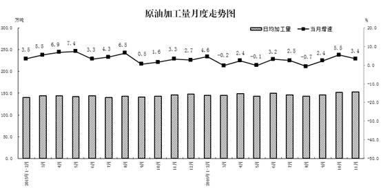 1-11月份,原油加工量同比增长2.7%,其中,11月份增长3.4%,日均加工量152.6万吨,较10月份增长0.5%。