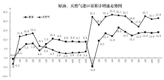 1-11月份,原油进口量34463万吨,同比增长14.0%,原油进口量占产量与进口量之和的比重已达到65.3%,比去年同期提高了4.7个百分点;天然气进口量4798万吨,同比增长21.6%,天然气进口量占产量与进口量之和的比重已达到34.9%,比去年同期提高了3.8个百分点。