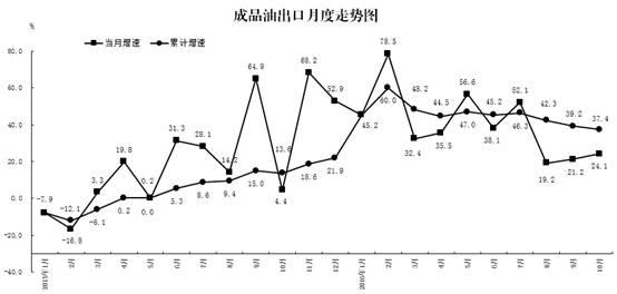 1-10月份,成品油(汽油、煤油、柴油、其他燃料油和石脑油)出口3811万吨,同比增长37.4%。其中,汽油、煤油、柴油出口量分别为780万吨、1025万吨、1215万吨,同比分别增长75.5%、6.4%、130.6%,其他燃料油出口有所减少,同比下降5.9%。10月份,成品油出口同比增长24.1%,增速较9月份加快2.9个百分点。