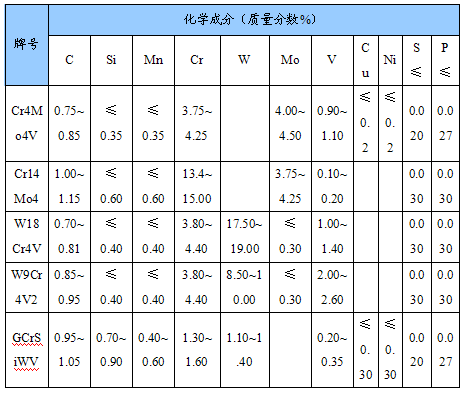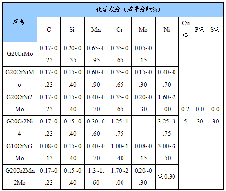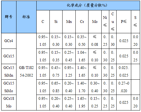 高碳铬轴承钢具有高的接触疲劳强度和耐磨性能,许多牌号属全淬透型钢,如GCr15、GCr15SiMn、GCr15SiMo、GCr18Mo。但由于有的轴承需要心部具有良好韧性而表面需要高硬度,因而又发展出限制淬透性轴承钢,如GCr4。