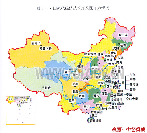 自1984年沿海开放座谈会以来,经国务院批准的国家级经济技术开发区共49家,31个省、市、自治区省会(首府)城市至少有1家国家级经济技术开发区。其中:东部沿海地区27个;中部地区9个;西部地区13个。在49个国家级经济技术开发区中,1995年以前批准设立及东部沿海有33个,2000年以后新批准设立的国家级经济技术开发区16个。以及苏州工业园、金桥出口加工区、厦门海沧投资区、宁波大榭开发区、海南洋浦开发区等5个享受国家级经济技术开发区政策的工业园区,形成了较为合理的全国布局。