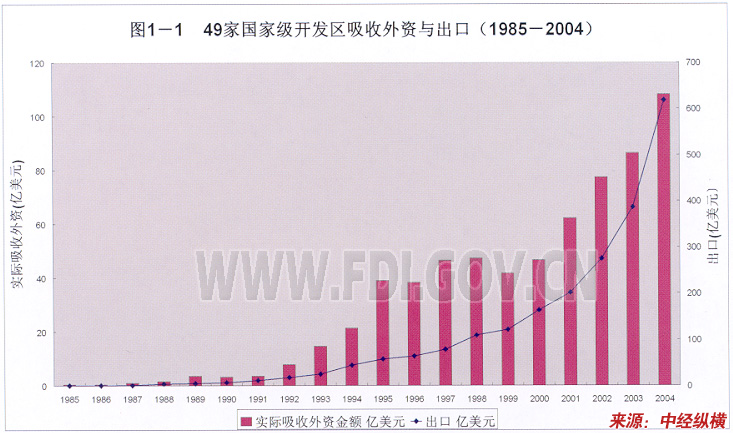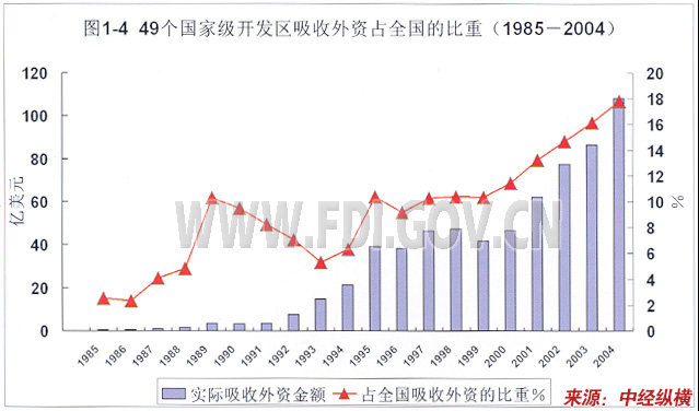在我国对外开放中处于前沿地位。从开放程度上看,国家级开发区是经济特区之后的第二开放带,在我国对外开放中处于前沿地位。国家级开发区在全国吸收外商直接投资的比重持续提高,2004年,54个国家级开发区实际利用外资136.07亿美元,占全国的22.44%。国家级开发区已经成为跨国公司的投资热点,截至2004年底,国家级开发区历年累计使用外资超过705亿美元,累计出口超过2195亿美元,累计实现工业产值超过5.8万亿元,是其20年累计开发投入资金总额的23倍。世界500强公司在国家级开发区投资兴办项目超过1000个。