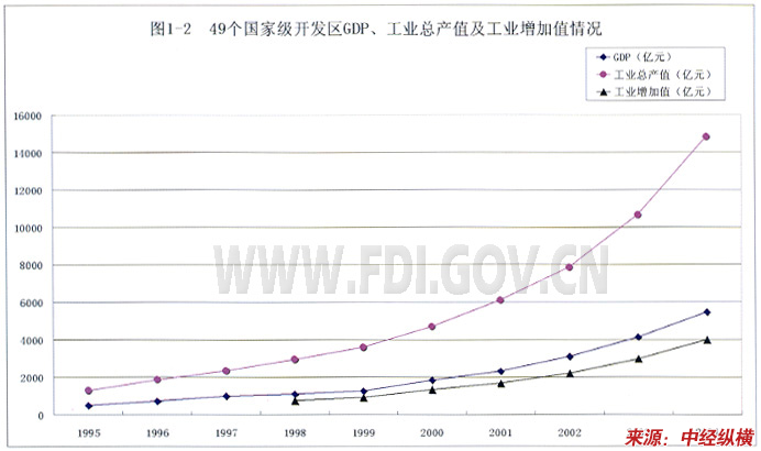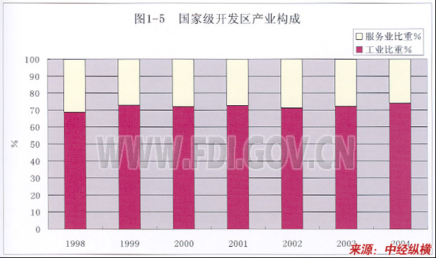 成为我国现代制造业的重要基地,带动我国产业结构的快速升级。国家级开发区通过引进具有世界先进水平的现代制造业以及跨国公司的研发机构,集约利用资源,促进产业集群发展,大大提升了我国的产业结构和在国际分工中的地位,走出一条在开放条件下实现新型工业化的道路。国家级开发区一直坚持以工业项目为主的方针,近年来,工业在国家级开发区的产业结构中一直占有70%左右的比重。2004年,国家级开发区实现工业增加值4856亿元,占国家级开发区GDP的74%。国家级开发区的产业特色鲜明,主导产业多集中于电子信息、交通运输设备制造、电气机械及器材、生物医药、化学原料及制品和食品饮料等 行业 。据不完全统计,2003年国家级开发区以上六个 行业 的总产值超过8000亿元,工业增加值超过2200亿元,占国家级开发区工业总产值和工业增加值的比例均超过60%。在一些技术含量较高的新兴制造业产品中,国家级开发区在全国占有重要地位。