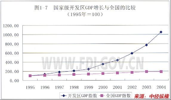成为经济发展的新增长点。2004年,49个国家级开发区和5个享受国家级开发区政策的园区,总共完成GDP6601.44亿元,占到了全国GDP总量中的4.85%。自1995—2004年间,国家级开发区GDP增长了9.5倍,而全国GDP仅增长了89%,国家级开发区经济增长率远高于全国经济增长速度。(参见下图)这一时期,国家级开发区对全国GDP增长的贡献率达到6.2%以上。国家级开发区不仅成为所在城市新的经济增长点,而且通过辐射、示范和拉动作用,成为区域经济发展的火车头。