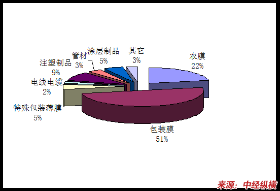国内低密度聚乙烯主要消费领域是薄膜(包括农膜),占总消费量的75%-80%,其它应用于注塑及电线电缆等领域。在薄膜消费领域中,包装膜所占比重最大,约在70%左右;农膜约为30%。
