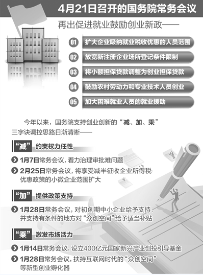 4月21日召开的国务院常务会议上,国务院再出促进就业鼓励创业新政,通过采取更加积极的就业政策、更大力度清理规范与行政审批相关的中介服务等举措,进一步支持大众创业、万众创新。
