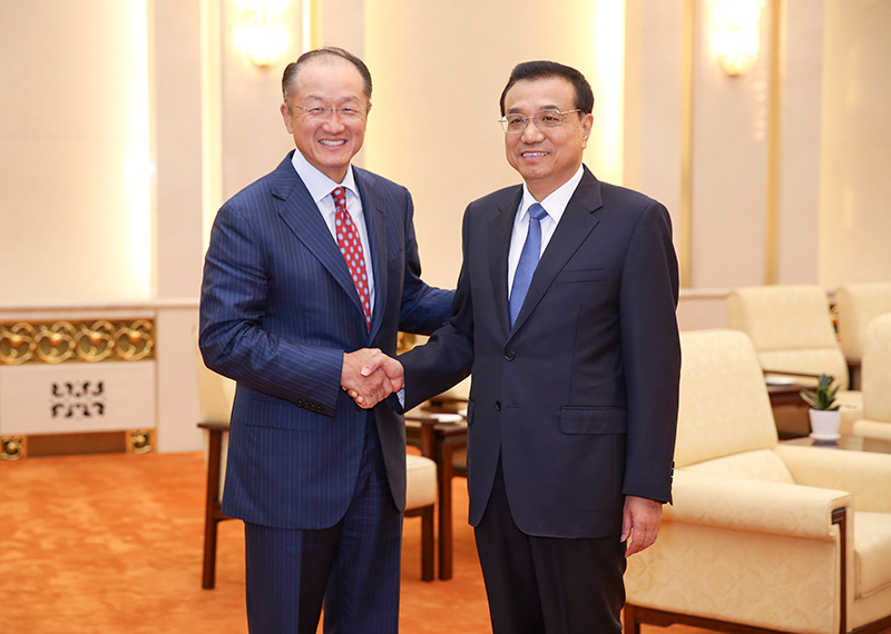 7月16日下午,中国国务院总理李克强在北京人民大会堂会见世界银行行长金墉。中新社发 刘震 摄