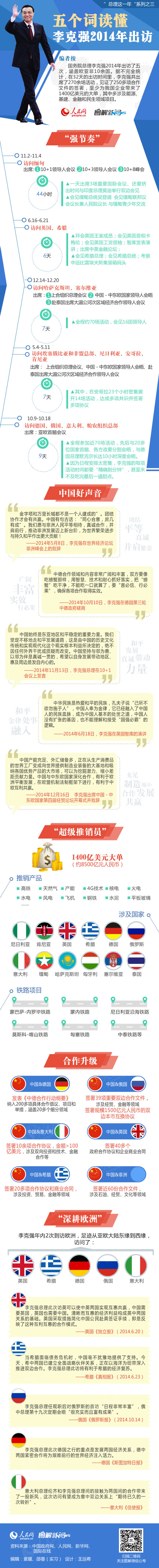 编者按:国务院总理李克强2014年出访了五次,涵盖欧亚非10余国。据不完全统计,在32天的出访时间里,李克强共出席了270余场活动,见证了250多项合作文件的签署,至少为我国企业带来了1400亿美元的大单,其中多涉及能源、基建、金融和民生领域项目。
