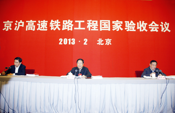 国家验收会议由验收委员会副主任委员徐宪平同志主持,验收委员会主任委员张平同志在会议上讲话。张平同志充分肯定了京沪高速铁路建设和运营取得的成绩,指出建设京沪高速铁路是党中央、国务院做出的重大决策。铁路部门统筹部署,团结带领13万建设者精心组织、精心设计、精心施工、精心管理,实现了工程质量总体优良和试运营安全、稳定。国家各有关部门、沿线各级地方党委政府密切配合,通力合作,给予了大力支持。各参建单位加强管理、顽强拼搏、无私奉献,确保了工程建造质量。京沪高速铁路完成国家验收,标志着京沪高速铁路建设任务全面完成。今后,管好用好京沪高速铁路,任务更加繁重,责任更为巨大。各有关方面要加强团结协作,完善规章制度,确保安全、高效运行,创新服务理念和管理模式,更好地满足人民群众出行需要。