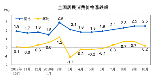 2018年10月份,全国居民消费价格同比上涨2.5%。其中,城市上涨2.5%,农村上涨2.6%;食品价格上涨3.3%,非食品价格上涨2.4%;消费品价格上涨2.8%,服务价格上涨2.1%。1-10月平均,全国居民消费价格比去年同期上涨2.1%。