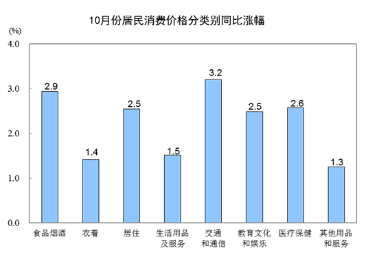 其他七大类价格同比均上涨。其中,交通和通信、医疗保健价格分别上涨3.2%和2.6%,居住、教育文化和娱乐价格均上涨2.5%,生活用品及服务、衣着、其他用品和服务价格分别上涨1.5%、1.4%和1.3%。