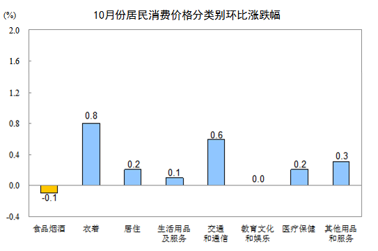 10月份,全国居民消费价格环比上涨0.2%。其中,城市上涨0.2%,农村上涨0.2%;食品价格下降0.3%,非食品价格上涨0.3%;消费品价格上涨0.3%,服务价格持平。