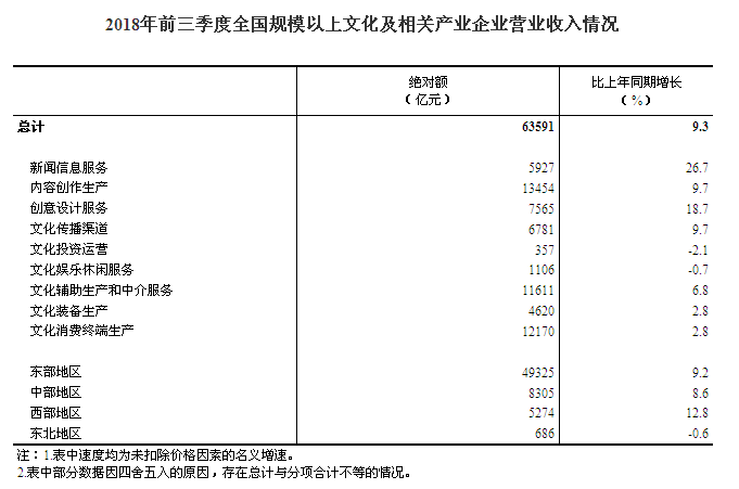 据对全国规模以上文化及相关产业6.0万家企业调查,2018年前三季度,上述企业实现营业收入63591亿元,比上年同期增长9.3%,继续保持较快增长。
