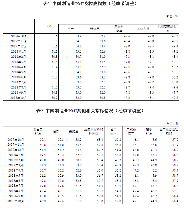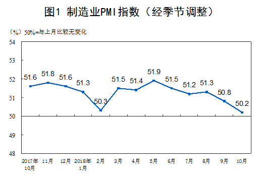 2018年10月份,中国制造业采购经理指数(PMI)为50.2%,比上月回落0.6个百分点,制造业总体继续运行在扩张区间,但扩张速度放缓。