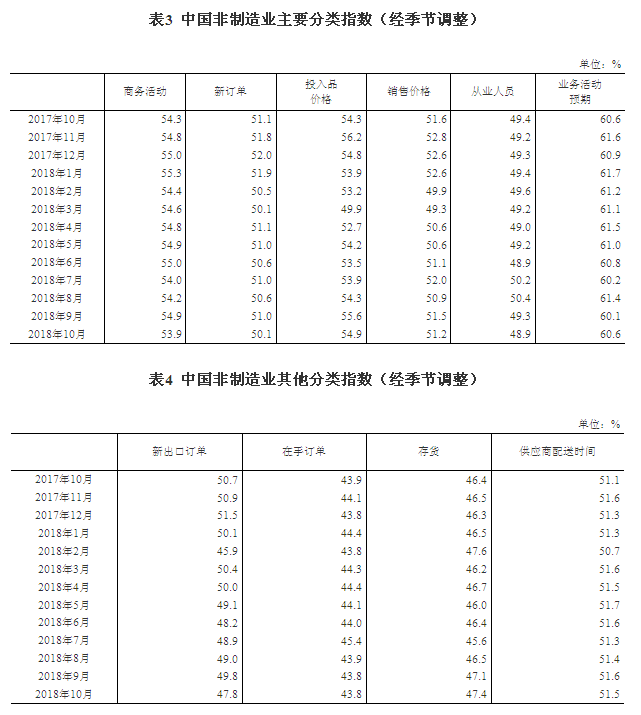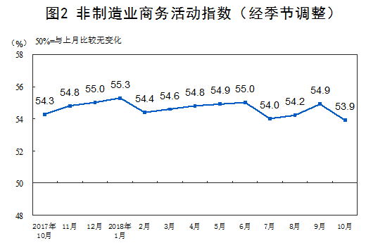 2018年10月份,中国非制造业商务活动指数为53.9%,比上月回落1.0个百分点,表明非制造业继续保持增长态势,增速有所放缓。