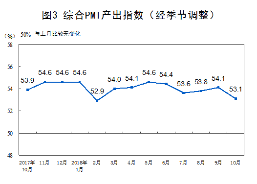 2018年10月份,综合PMI产出指数为53.1%,比上月回落1.0个百分点,表明我国企业生产经营活动延续扩张态势,但增速有所放缓。