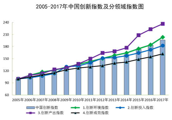 据国家统计局社科文司《中国创新指数研究》课题组测算[1],2017年中国创新指数为196.3(以2005年为100),比上年增长6.8%。分领域看,创新环境指数、创新投入指数、创新产出指数和创新成效指数分别达到203.6、182.8、236.5和162.2,分别比上年增长10.4%、6.2%、5.9%和4.8%。测算结果表明,2017年,我国创新环境进一步优化,创新投入力度继续加大,创新产出持续提升,创新成效稳步增强,创新能力向高质量发展要求稳步迈进。