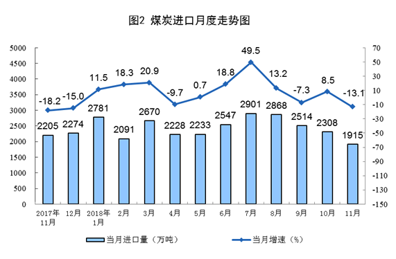 11月份,进口煤炭1915万吨,同比下降13.1%,进口量比上月减少393万吨。1-11月份,进口煤炭2.7亿吨,同比增长9.3%。