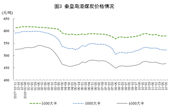 12月初,秦皇岛港5500大卡煤炭综合交易价格为每吨580元,比11月初下跌4元;5000大卡煤炭为每吨523元,下跌7元;4500大卡煤炭为每吨467元,下跌5元。