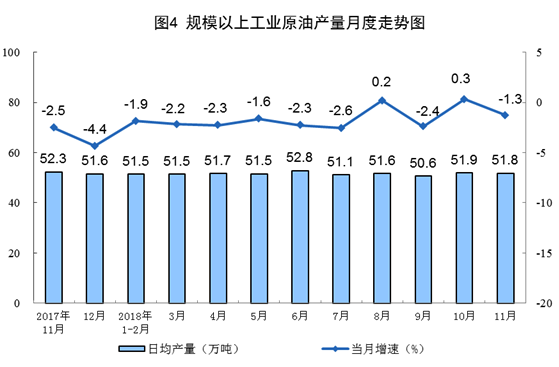 11月份,生产原油1553万吨,同比下降1.3%,增速由正转负,上月为增长0.3%;日均产量51.8万吨,环比减少0.1万吨。1-11月份,原油产量17275万吨,同比下降1.6%。