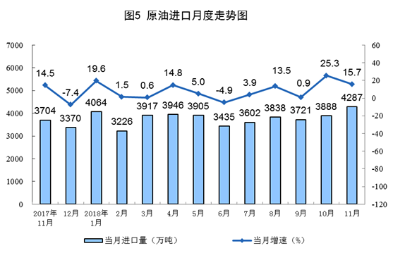 原油进口大幅增加。11月份进口原油4287万吨,同比增长15.7%,进口量比上月增加399万吨。1-11月份,进口原油41811万吨,同比增长8.4%。