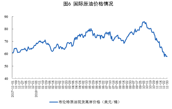 国际原油价格连续下跌。截至11月30日,布伦特原油现货离岸价格为57.71美元/桶,比10月底下跌17.13美元/桶。