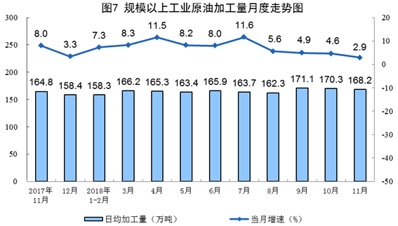 11月份,原油加工量5046万吨,同比增长2.9%,增速比上月回落1.7个百分点;日均加工168.2万吨,环比减少2.1万吨。1-11月份,原油加工量55448万吨,同比增长7.2%。