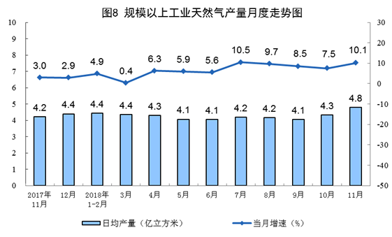 为保障冬季采暖期天然气供应需求,11月份,生产天然气143亿立方米,同比增长10.1%,增速比上月加快2.6个百分点;日均生产4.8亿立方米,环比增加0.5亿立方米,创历史新高。1-11月份,天然气产量1438亿立方米,同比增长6.6%。