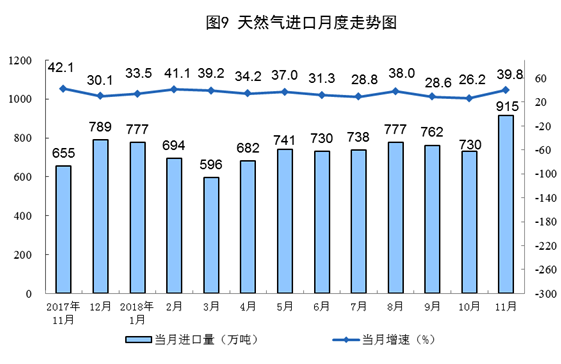 11月份,进口天然气915万吨,同比增长39.8%,进口量比上月增加185万吨。1-11月份,进口天然气8119万吨,同比增长33.8%。