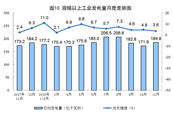 11月份,发电量5543.0亿千瓦时,同比增长3.6%,增速比上月回落1.2个百分点;日均发电184.8亿千瓦时,环比增加12.9亿千瓦时。1-11月份,发电量同比增长6.9%,增速较1-10月份回落0.3个百分点。