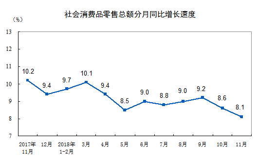 2018年1-11月份,社会消费品零售总额345093亿元,同比增长9.1%。其中,限额以上单位消费品零售额130830亿元,增长6.1%。