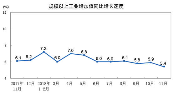 分三大门类看,11月份,采矿业增加值同比增长2.3%,增速较10月份回落1.5个百分点;制造业增长5.6%,回落 0.5个百分点;电力、热力、燃气及水生产和供应业增长9.8%,加快3.0个百分点。