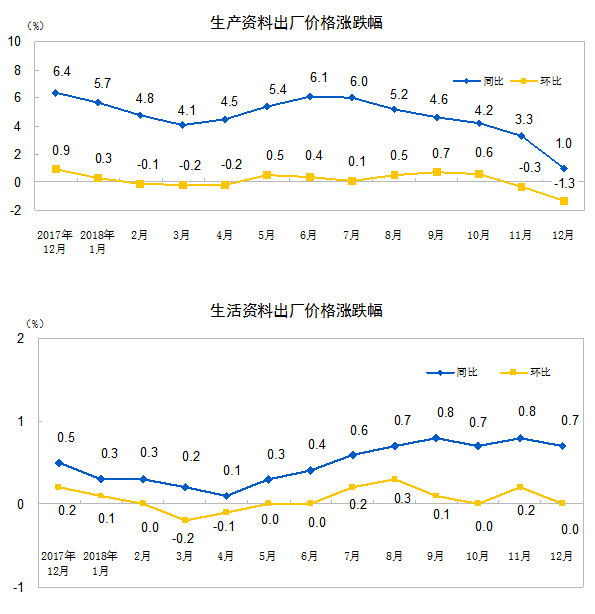 12月份生产资料价格同比上涨1.0%,影响工业生产者出厂价格总水平上涨约0.75个百分点。其中,采掘工业价格上涨3.8%,原材料工业价格上涨0.8%,加工工业价格上涨0.8%。生活资料价格同比上涨0.7%,影响工业生产者出厂价格总水平上涨约0.16个百分点。其中,食品价格上涨0.9%,衣着价格上涨1.6%,一般日用品价格上涨0.4%,耐用消费品价格上涨0.2%。