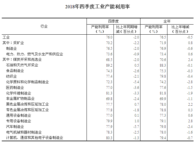 分三大门类看,四季度,采矿业产能利用率为70.2%,比上年同期下降2.2个百分点;制造业产能利用率为76.5%,比上年同期下降2.0个百分点;电力、热力、燃气及水生产和供应业产能利用率为73.6%,比上年同期下降0.9个百分点。