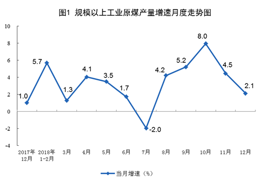 12月份,原煤产量3.2亿吨,同比增长2.1%,增速比上月回落2.4个百分点;日均产量1033万吨,环比减少18万吨。