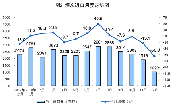 冬季供暖季以来,国内原煤产量稳定增长,市场供给较为充足。受此影响,12月份煤炭进口量大幅减少,仅进口1023万吨,为2014年6月份以来最低月进口量,同比下降55.0%。全年进口煤炭2.8亿吨,同比增长3.9%,比上年回落2.2个百分点。