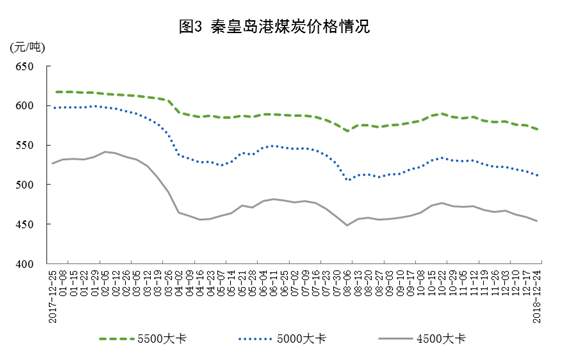 煤炭价格稳中有降。截至12月底,秦皇岛港5500大卡煤炭综合交易价格为每吨570元,比11月末下跌9元;5000大卡煤炭为每吨512元,下跌11元;4500大卡煤炭为每吨454元,下跌12元。