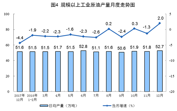 12月份,主要油田按计划增产,生产原油1633万吨,同比增长2.0%,增速由负转正,上月为下降1.3%;日均产量52.7万吨,环比增加0.9万吨。