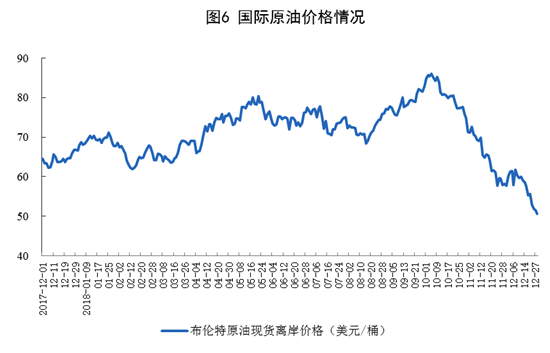 国际原油价格震荡下跌。截至12月28日,布伦特原油现货离岸价格为每桶50.57美元,比11月底下跌7.14美元,比年初低16.08美元。
