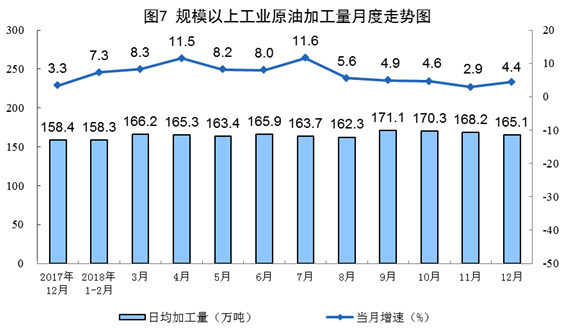 12月份,原油加工量5117万吨,同比增长4.4%,增速比上月加快1.5个百分点;日均加工165.1万吨,环比减少3.1万吨。