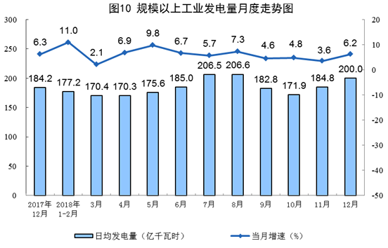受全国大范围低温天气影响,用电需求增加,电力生产加快。12月份发电6200亿千瓦时,同比增长6.2%,增速比上月加快2.6个百分点;日均发电200亿千瓦时,接近夏季高温天气发电水平。