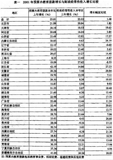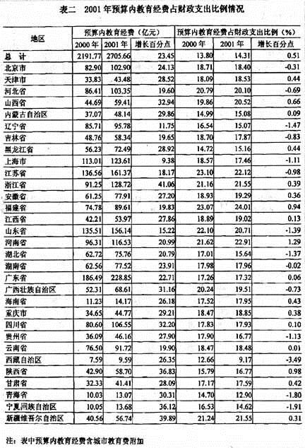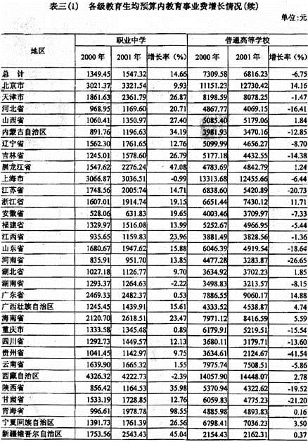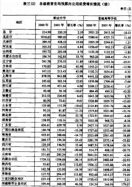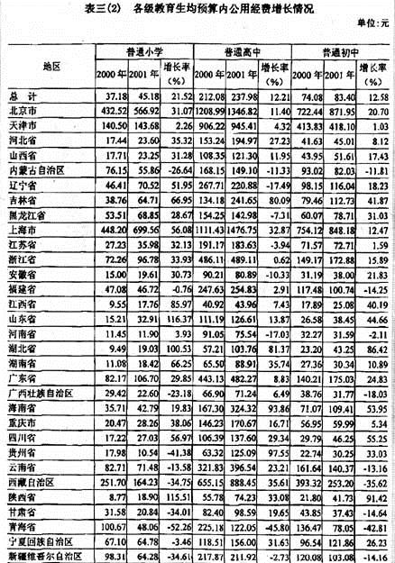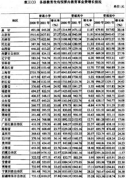 一、全国教育经费情况 2001年,全国教育经费为4637.66亿元,比上年的3849.08亿元增长20.49%。其中,国家财政性教育经费(包括各级财政对教育的拨款、城乡教育费附加、企业办中小学支出以及校办产业减免税等项)为3057.01亿元,比上年的2562.61亿元增长19.29%。 二、落实《教育法》规定的“三个增长”情况 1.中央和地方各级政府预算内教育拨款(不包括城市教育费附加)为2582.38亿元,比上年的2085.68亿元增长23.81%。同年,全国财政收入为16386亿元,比上年增长22.33%,全国预算内教育拨款增长速度高于财政收入的增长速度1.48个百分点。 2.各级教育生均预算内教育事业费支出增长情况2001年全国普通小学、普通初中、普通高中、职业中学、普通高等学校生均预算内教育事业费支出情况是: (1)全国普通小学生均预算内事业费支出为645.28元,比上年的491.58元增长31.27%,其中,农村普通小学生均预算内事业费支出为550.96元,比上年的412.97元增长33.41%。普通小学生均预算内事业费支出增长最快的是陕西省(47.93%)。 (2)全国普通初中生均预算内事业费支出为817.02元,比上年的679.81元增长20.18%,其中,农村普通初中生均预算内事业费支出为656.18元,比上年的533.54元增长22.99%。普通初中生均预算内事业费支出增长最快的是宁夏回族自治区(36.38%)。 (3)全国普通高中生均预算内事业费支出为1471.12元,比上年的1314.99元增长11.87%。普通高中生均预算内事业费支出增长最快的是贵州省(35.82%)。 (4)全国职业中学生均预算内事业费支出为1547.32元,比上年的1349.45元增长14.66%。职业中学生均预算内事业费支出增长最快的是青海省(98.55%)。 (5)全国普通高等学校生均预算内事业费支出为6816.23元,比上年的7309.58元减少6.75%。普通高等学校生均预算内事业费支出增长最快的是广东省(14.88%)。 3.各级教育生均预算内公用经费支出增长情况2001年全国普通小学、普通初中、普通高中、职业中学和普通高等学校生均预算内公用经费支出情况是: (1)全国普通小学生均预算内公用经费支出为45.18元,比上年的37.18元增长21.52%,其中,农村普通小学生均预算内公用经费支出为28.12元,比上年的24.11元增长16.63%。普通小学生均预算内公用经费支出增长最快的是山东省(116.37%)。 (2)全国普通初中生均预算内公用经费支出为83.40元,比上年的74.08元增长12.58%,其中,农村普通初中生均预算内公用经费支出为44.95元,比上年的38.67元增长16.24%。普通初中生均预算内公用经费支出增长最快的是陕西省(91.42%)。 (3)全国普通高中生均预算内公用经费支出为237.98元,比上年的212.08元增长12.21%。普通高中生均预算内公用经费支出增长最快的是贵州省(97.55%)。 (4)全国职业中学生均预算内公用经费支出为220.39元,比上年的214.90元增长2.55%。职业中学生均预算内公用经费支出增长最快的是青海省(113.80%)。 (5)全国普通高等学校生均预算内公用经费支出为2613.56元,比上年的2921.23元下降10.53%。普通高等学校生均预算内公用经费支出增长最快的是新疆维吾尔自治区(179.07%)。 三、预算内教育经费占财政支出比例情况 按预算内教育经费包含城市教育费附加的口径计算,2001年全国预算内教育经费占财政支出18903亿元(2002年《中国统计年鉴》公布数)的比例为14.31%,比上年的13.80%增加了0.51个百分点。从全国情况看,有14个省、自治区、直辖市预算内教育经费占财政支出比例比上年有不同程度的下降。 四、国家财政性教育经费占国内生产总值比例情况 据统计,2001年全国国内生产总值为95933亿元,国家财政性教育经费占国内生产总值比例为3.19%,比上年的2.87%增加了0.32个百分点,为1989年对此项指标进行监测以来的最高水平。 2001年全国教育经费执行情况监测结果表明,各级政府通过贯彻《教育法》,落实教育优先发展的战略地位,政府教育投入总量继续增加,预算内教育经费占财政支出比例比上年有所上升,但仍有一些省、自治区已连续几年没有达到《教育法》规定的教育投入增长要求。 教育部 国家统计局 财政部 二○○二年十二月三十日 注: 1.公告中所列教育经费数据以教育经费统计口径为准,包括国民教育序列学校所支出的经费,不包括党政工团的教育经费、职工培训费、党政群干训费和军事院校的经费。 2.公告中所涉及的全国性统计数据,均不包括台湾省、香港特别行政区、澳门特别行政区。 3.公告中的2001年全国国内生产总值95933亿元、全国财政收入16386亿元和财政支出18903亿元等数据来源于2002年《中国统计年鉴》。