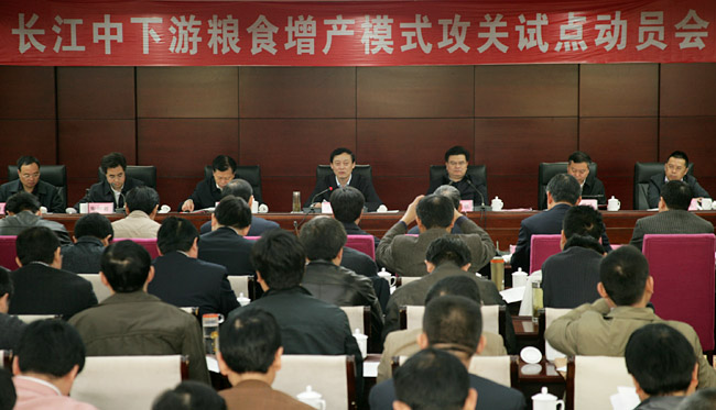 3月10日,农业部在江西省景德镇召开长江中下游粮食增产模式攻关试点动员会。会议提出长江中下游粮食增产模式攻关的具体目标是做到稳中有进——“稳”就是稳住面积,力争双季稻面积恢复增加500万亩、油菜面积增加500万亩;“进”就是突破技术瓶颈,力争到2020年试点县水稻平均亩产提高90公斤、油菜平均亩产提高30公斤,带动亩均效益增加150元以上。