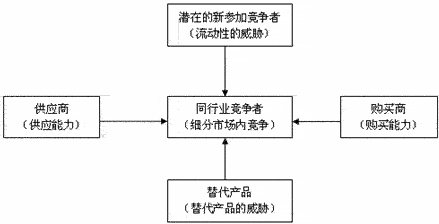 根据波特(M.E.Porter)的观点,一个 行业 中的竞争,不止是在原有竞争对手中进行,而是存在着五种基本的竞争力量:潜在的 行业 新进入者、替代品的竞争、买方讨价还价的能力、供应商讨价还价的能力以及 行业 内竞争者现在的竞争能力。这五种基本竞争力量的状况及综合强度,决定着 行业 的竞争激烈程度,从而决定着 行业 中最终的获利潜力以及资本向本 行业 的流向程度,这一切最终决定着企业保持高收益的能力。