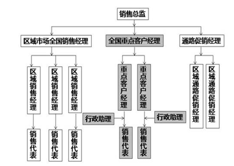 这种组织结构,是将传统的销售团队细分为三个部门:重点客户管理部门、区域市场管理部门、通路促销部门。其中重点客户管理部门专门负责大型重点客户从总部到区域直至门店的服务和管理工作,例如:家乐福、沃尔玛、国美等等。由于重点客户在公司的销售额中占比逐年增大,而且大型客户对供应商而言,具有品牌示范效应,众多的渠道批发商就是跟着大型零售商的步伐前进的,大型零售客户卖什么,批发商就推什么,同时大型客户的管理需要较高的沟通、 分析 和计划能力,因而实践中企业往往将销售队伍中的精英力量调集到重点客户管理部门工作。