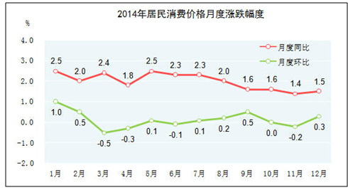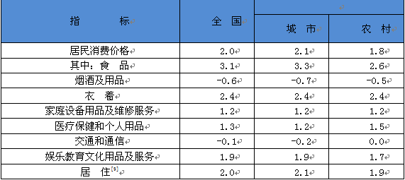 价格水平涨幅较低。全年居民消费价格比上年上涨2.0%,其中食品价格上涨3.1%。固定资产投资价格上涨0.5%。工业生产者出厂价格下降1.9%。工业生产者购进价格下降2.2%。农产品生产者价格下降0.2%。