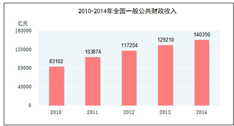 2014年全国一般公共财政收入140350亿元,比上年增加11140亿元,增长8.6%,其中税收收入119158亿元,增加8627亿元,增长7.8%。